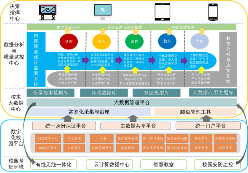 三盟高職教學(xué)診改大數(shù)據(jù)解決方案基于“五縱五橫,一平臺”架構(gòu),構(gòu)建形成了涵蓋決策指揮、質(zhì)量生成、資源建設(shè)、支持服務(wù)和監(jiān)督控制五個縱向系統(tǒng)以及學(xué)院、專業(yè)、課程、教師、學(xué)生五個橫向?qū)用?,建設(shè)一套能夠?qū)崿F(xiàn)信息采集系統(tǒng)、數(shù)據(jù)治理、數(shù)據(jù)分析、數(shù)據(jù)畫像、數(shù)據(jù)監(jiān)測及預(yù)警等功能于一體的診斷與改進(jìn)數(shù)據(jù)支撐平臺。