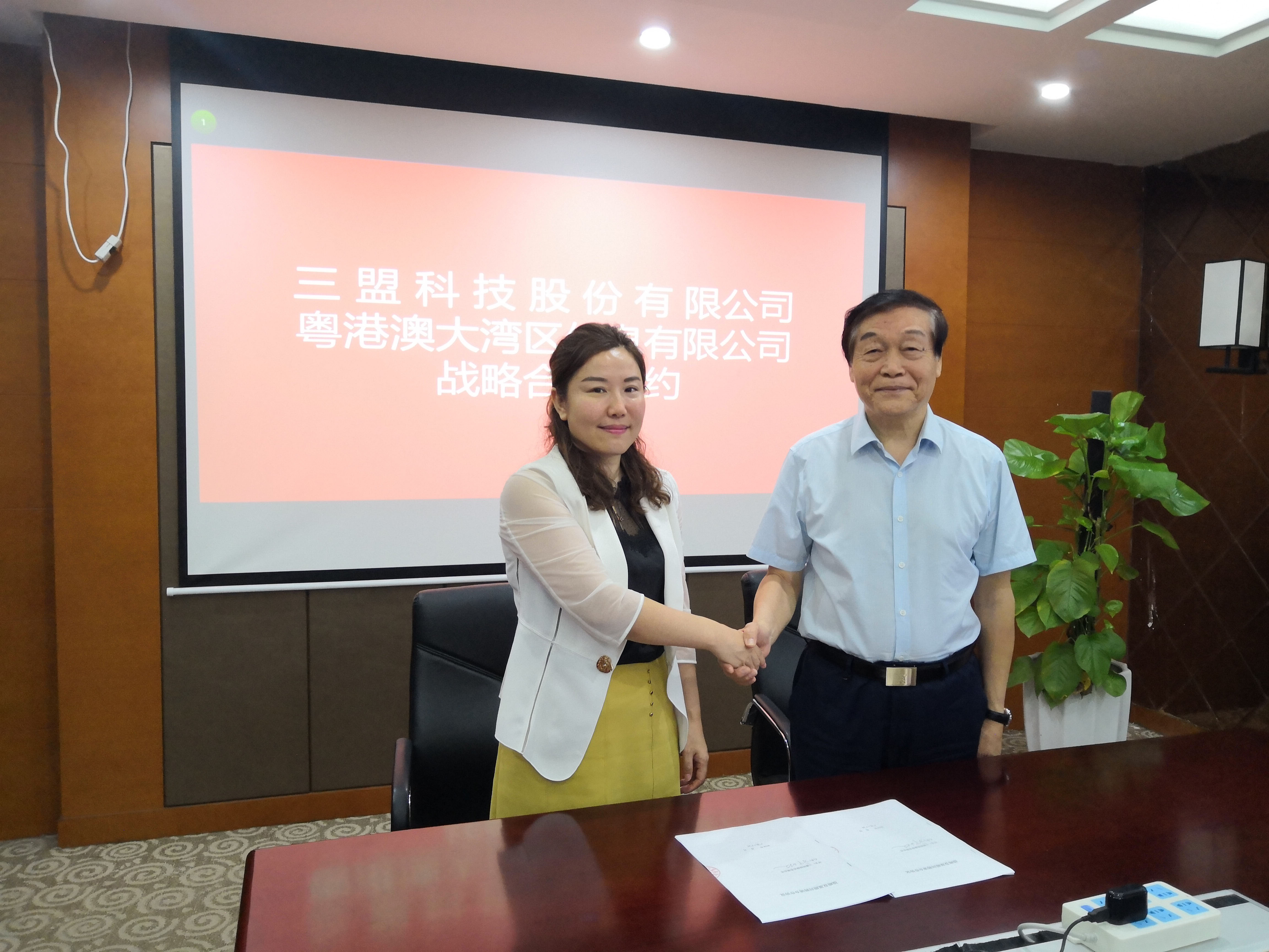 2019年10月26日,三盟科技與廣東省商業(yè)聯(lián)合會/粵港澳大灣區(qū)信息有限公司簽署戰(zhàn)略合作協(xié)議,這是三盟科技首次與粵港澳大灣區(qū)企業(yè)建立戰(zhàn)略合作關(guān)系。雙方將充分發(fā)揮各自資源和業(yè)務(wù)的特點(diǎn)及優(yōu)勢,在市場營銷、城市教育產(chǎn)業(yè)推動等多個方面強(qiáng)強(qiáng)聯(lián)合,實現(xiàn)資源共享、優(yōu)勢互補(bǔ)。