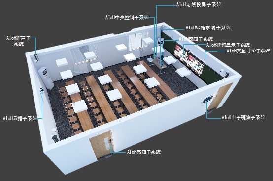 AIoH視頻顯示子系統(tǒng)、AIoH中央控制子系統(tǒng)、AIoH交互討論子系統(tǒng)、AIoH遠(yuǎn)程求助子系統(tǒng)、AIoH感知子系統(tǒng)、AIoH電子班牌子系統(tǒng)、AIoH錄播子系統(tǒng)、AIoH無(wú)線投屏子系統(tǒng)、AIoH擴(kuò)聲子系統(tǒng)等9大智能硬件AIoH子系統(tǒng)全方位建設(shè)智慧教室。