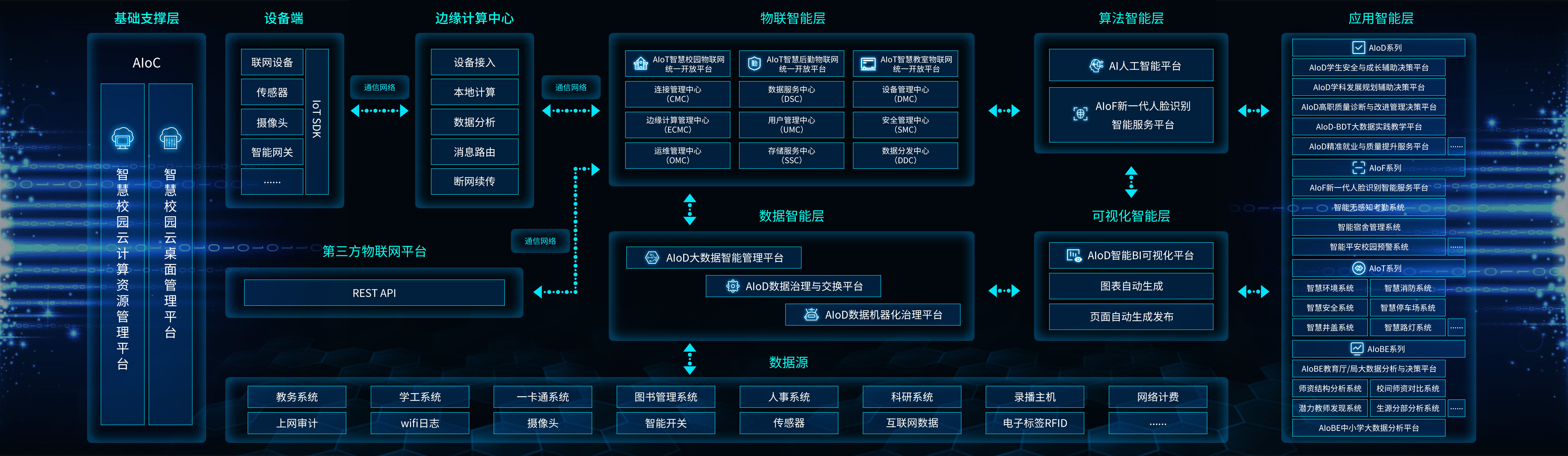 教育大腦智慧校園整體解決方案,融合人工智能技術(shù)AI、大數(shù)據(jù)技術(shù)AIoD、物聯(lián)網(wǎng)技術(shù)AIoT、人臉識別技術(shù)AIoF四大核心技術(shù)與和基礎(chǔ)支撐層、物聯(lián)智能層、數(shù)據(jù)智能層、算法智能層、可視化智能層、應(yīng)用智能層六大產(chǎn)品方向,包括近百款產(chǎn)品自主研發(fā)平臺類及應(yīng)用類產(chǎn)品,專為智慧教育,助力教育單位以“AI+大數(shù)據(jù)”為核心的智慧校園建設(shè),打造教育單位自己的智慧教育大腦!