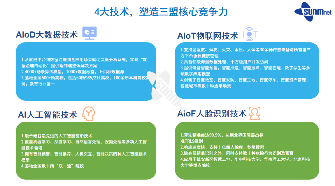 經(jīng)過多年的技術(shù)創(chuàng)新與實(shí)踐 , 三盟科技多項(xiàng)技術(shù)指標(biāo)已達(dá)國際先進(jìn)水平。目前,公司已掌握AI人工智能技術(shù)、AIoD大數(shù)據(jù)技術(shù)、AIoT物聯(lián)網(wǎng)技術(shù)、AIoF人臉識(shí)別技術(shù)4大核心技術(shù),形成較強(qiáng)的市場競爭優(yōu)勢。