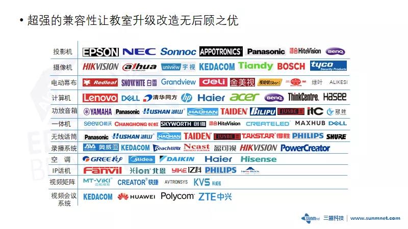 智校則不同,采用三盟科技自主研發(fā)的可編程中控系統(tǒng),所管理的多媒體教學設備可兼容市場上98%以上的品牌,因此校方不用擔心設備兼容性的問題。