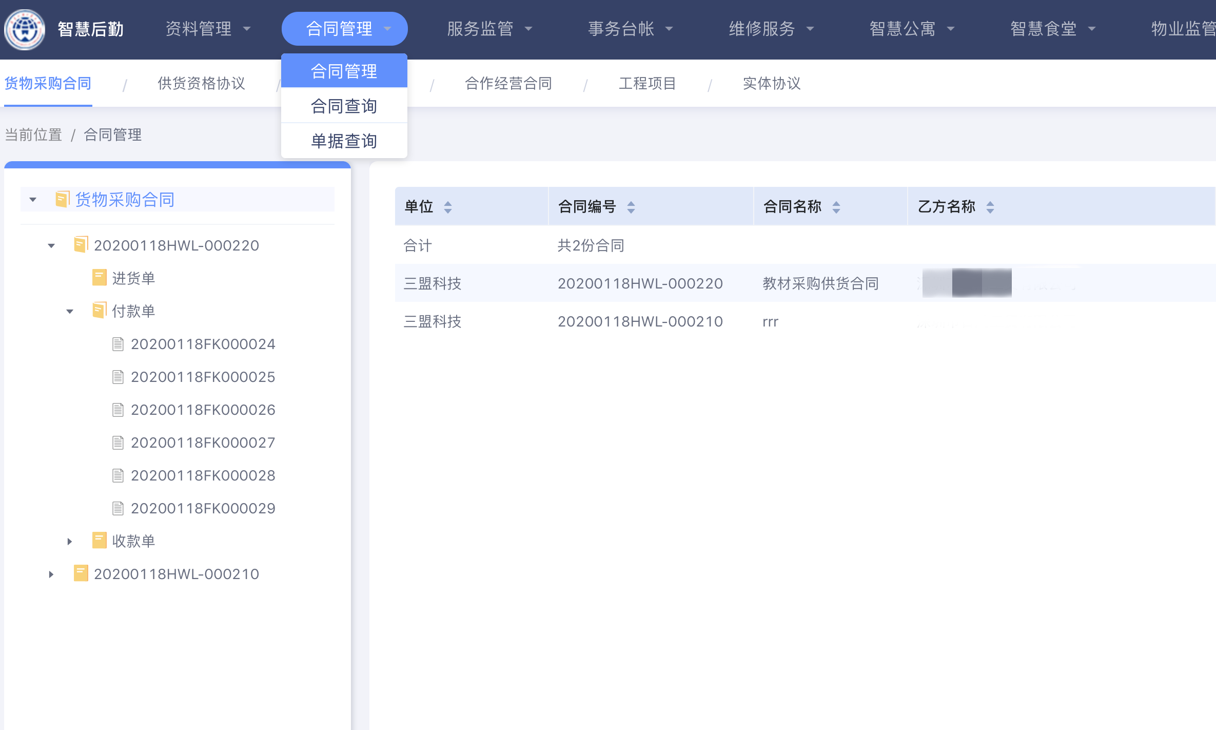 在后勤管理中,合同管理是極易出現(xiàn)疏漏的環(huán)節(jié)。合同量大,一旦出現(xiàn)審批不及時(shí),容易造成招標(biāo)延誤,服務(wù)斷檔等問(wèn)題。合同管理平臺(tái)通過(guò)將各類合同及單據(jù)進(jìn)行線上審批,并設(shè)置提醒機(jī)制保證審批工作快速完成,有效促進(jìn)合作、付款及收貨工作的高效達(dá)成。能耗監(jiān)控平臺(tái)包含商戶繳費(fèi)、師生繳費(fèi)、空調(diào)申請(qǐng)、電話申請(qǐng)等模塊。該平臺(tái)解決了能源監(jiān)管的盲區(qū),通過(guò)統(tǒng)一監(jiān)管,為學(xué)校節(jié)約能源,節(jié)省成本。值得關(guān)注的是,后勤工作除了硬件及應(yīng)用性建設(shè)之外,對(duì)留存數(shù)據(jù)的挖掘和再利用也是重中之重。三盟通過(guò)建立大數(shù)據(jù)平臺(tái),幫助廣外留存有價(jià)值的數(shù)據(jù)并進(jìn)行更深層分析,有效提升解決學(xué)??缦到y(tǒng)的數(shù)據(jù)分析及預(yù)測(cè)能力。此外,智慧后勤平臺(tái)還提供了移動(dòng)端入口。管理員除了可在網(wǎng)頁(yè)端開(kāi)展后勤管理工作外,還可通過(guò)手機(jī)APP進(jìn)行遠(yuǎn)程管理,保障后勤服務(wù)的及時(shí)性。同時(shí),也相當(dāng)于為全校師生提供了“移動(dòng)后勤辦事大廳”,通過(guò)手機(jī)APP就能享受預(yù)約、申請(qǐng)、投訴、維修、繳費(fèi)等多種后勤服務(wù)。