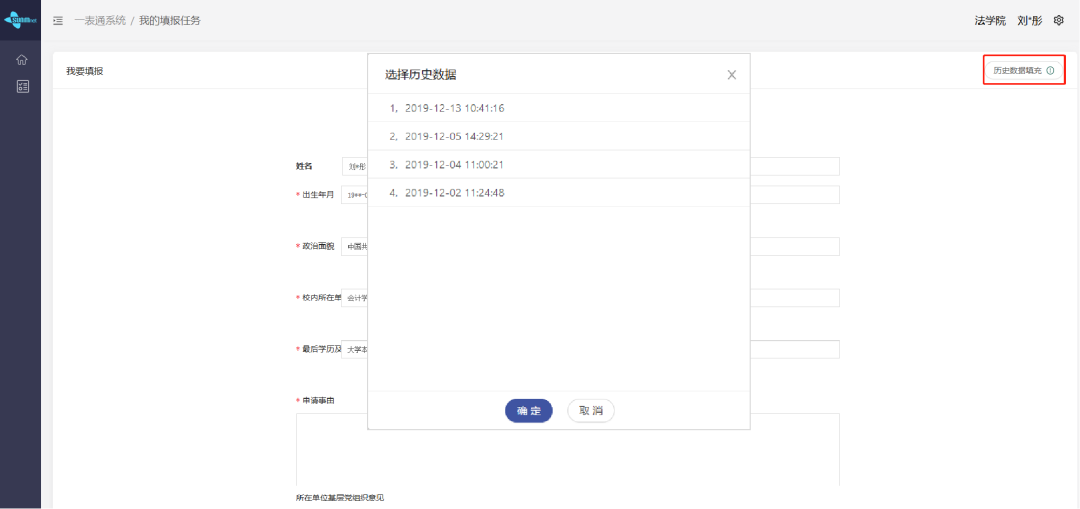 教師在填表時(shí)只需點(diǎn)擊“歷史數(shù)據(jù)填充”,選擇歷史數(shù)據(jù),系統(tǒng)自動(dòng)匹配完成填充。后續(xù)僅需完善剩余的主觀內(nèi)容即可,讓你的填表工作從此“開(kāi)外掛”。