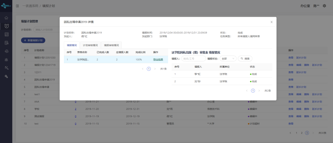 行政老師通過(guò)在系統(tǒng)上發(fā)起提報(bào)計(jì)劃,并設(shè)定起始時(shí)間,選擇需要填報(bào)的表單和需要填報(bào)的人員,并制定該填報(bào)任務(wù)的工作流程和審核流程,即完成一個(gè)填報(bào)計(jì)劃的制定。