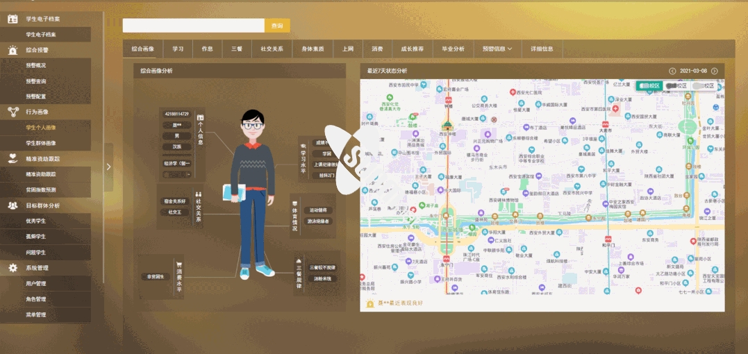 基于對學(xué)生個體的了解,有利于學(xué)校實現(xiàn)學(xué)生學(xué)業(yè)預(yù)警、行為預(yù)警、精準(zhǔn)資助、個性化學(xué)習(xí)推薦等目的,針對性地引導(dǎo)學(xué)生生活和學(xué)業(yè)健康發(fā)展。