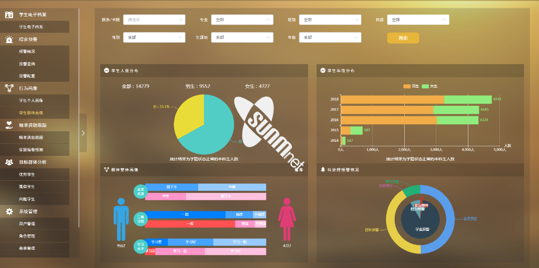 系統(tǒng)依托優(yōu)越的大數(shù)據(jù)技術(shù),對學(xué)生的校園卡消費、上網(wǎng)、考試成績、考勤、門禁等多種數(shù)據(jù)源進行綜合分析,挖掘數(shù)據(jù)價值,確保數(shù)據(jù)分析結(jié)果高度準(zhǔn)確,有效指導(dǎo)管理決策。