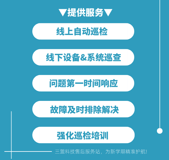 疫情全面放開后的第一個(gè)新學(xué)期,相較于以往來的更早一些,為支撐各大高校開學(xué)工作的開展,全力保障學(xué)校管理信息化、教育教學(xué)信息化正常運(yùn)行,三盟科技成立售后服務(wù)專項(xiàng)組,啟動(dòng)“春季校園專項(xiàng)巡檢行動(dòng)”,針對(duì)我司交付的項(xiàng)目變“被動(dòng)故障”為“主動(dòng)排除”,在巡檢行動(dòng)中早發(fā)現(xiàn)、早報(bào)告、早處置,防患于未然,消除開學(xué)季后顧之憂。
