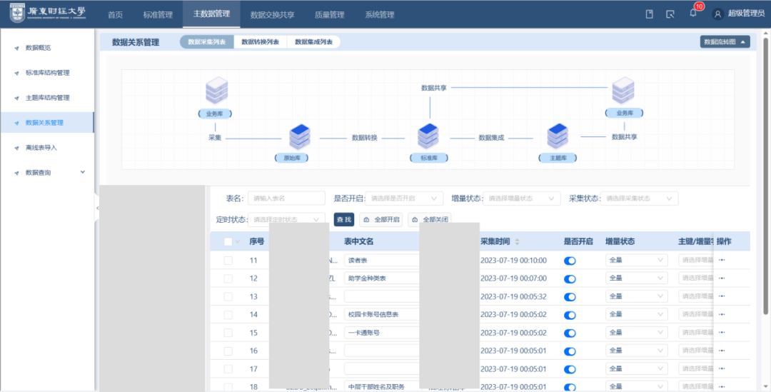 廣財(cái)數(shù)據(jù)治理的首要舉措,就是建設(shè)數(shù)據(jù)治理共享交換平臺,實(shí)現(xiàn)對多源數(shù)據(jù)的采集。平臺采集了人事系統(tǒng)、科研系統(tǒng)、教務(wù)系統(tǒng)、學(xué)工系統(tǒng)、研究生管理系統(tǒng)、財(cái)務(wù)系統(tǒng)、后勤系統(tǒng)等13個業(yè)務(wù)系統(tǒng)的結(jié)構(gòu)化數(shù)據(jù)。