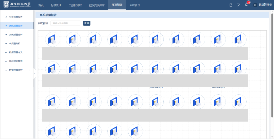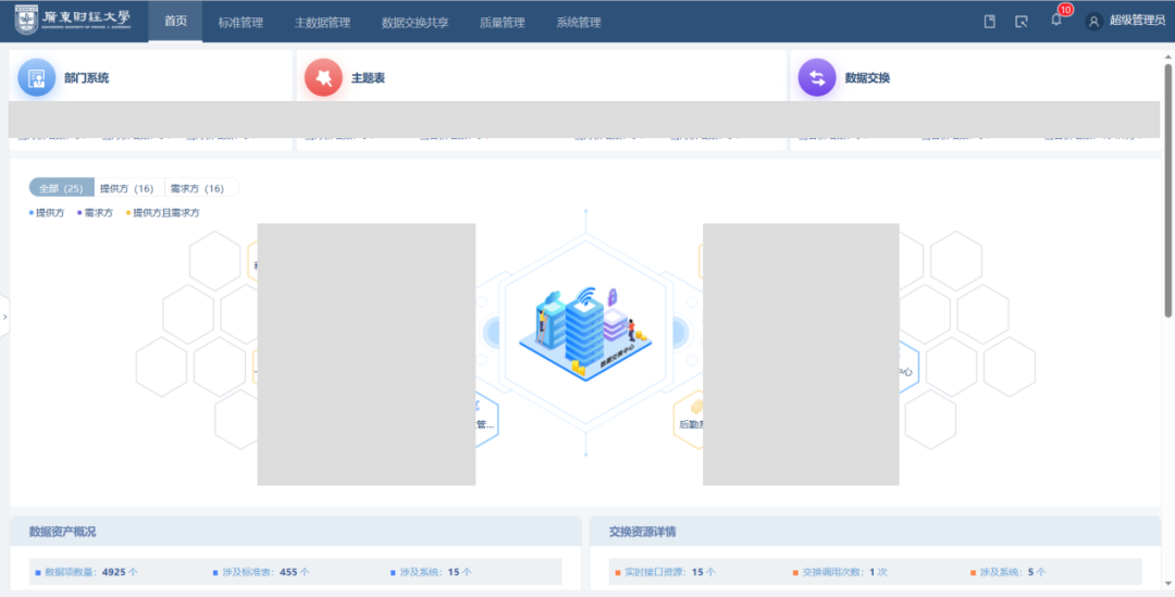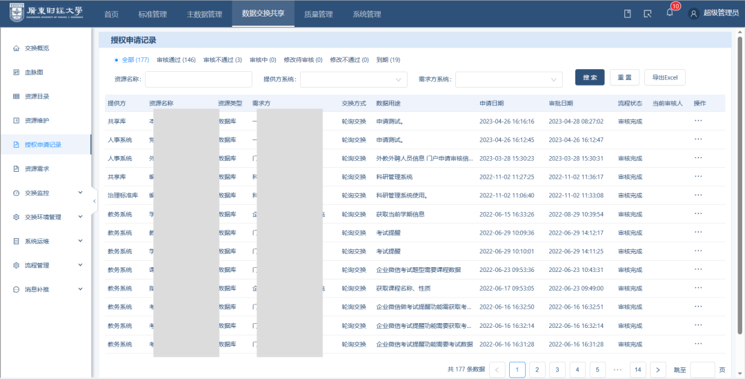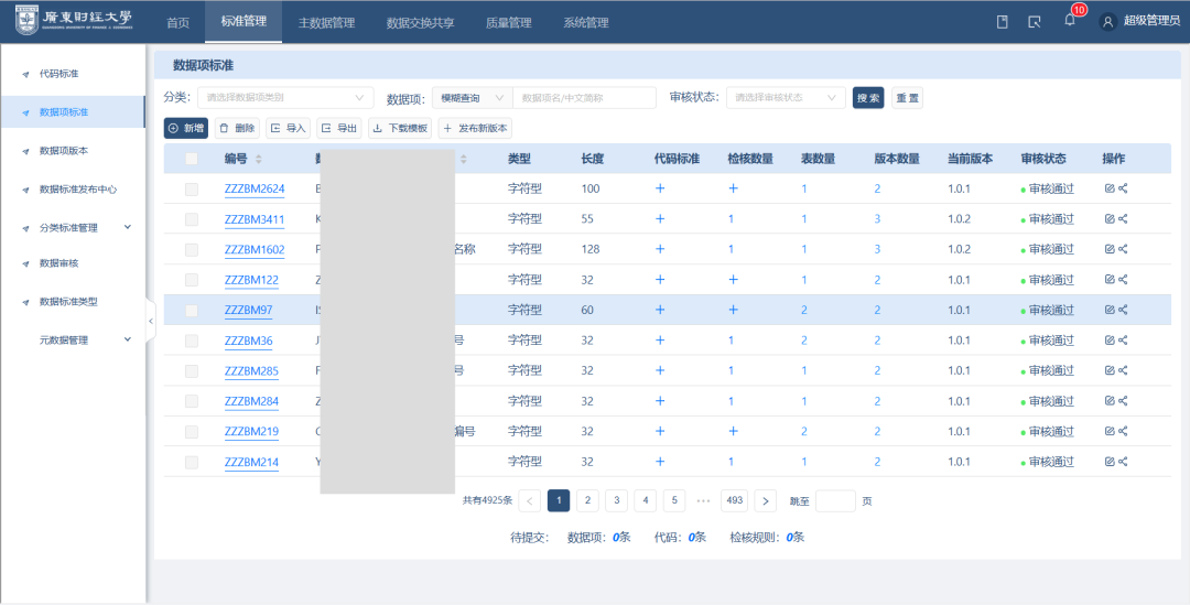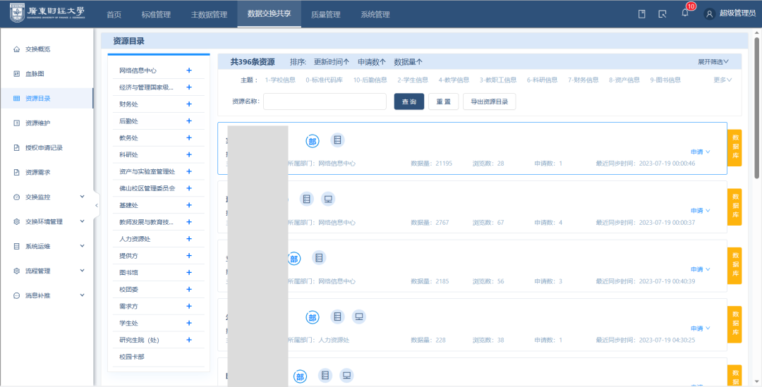 截至目前,廣財(cái)?shù)臄?shù)據(jù)治理已取得了顯著進(jìn)展和成效。自2019年12月開展數(shù)據(jù)治理至今,學(xué)校已建成數(shù)據(jù)項(xiàng)標(biāo)準(zhǔn)4925個,代碼標(biāo)準(zhǔn)263條。平臺已對接13個業(yè)務(wù)系統(tǒng),累計(jì)開放數(shù)據(jù)資源396個,完成資源授權(quán)數(shù)146個,累計(jì)數(shù)據(jù)交換總數(shù)高達(dá)22.2億條。