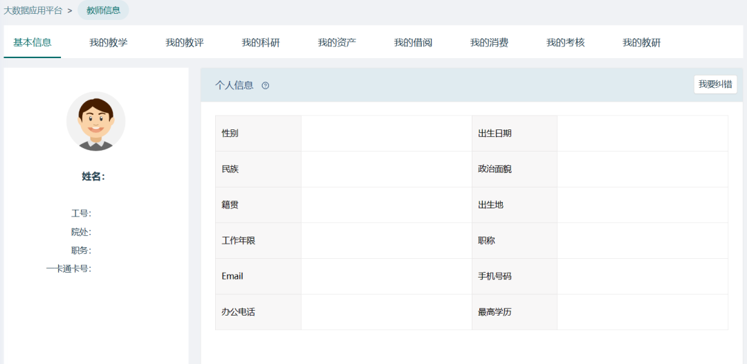 “教師一張表”主要針對全校教職工的在校生活及工作成果進(jìn)行數(shù)據(jù)呈現(xiàn),主要包含教職工的基本信息、教學(xué)、教研,科研、消費(fèi)等方面的數(shù)據(jù),綜合分析教職工的校園工作生活狀態(tài)。