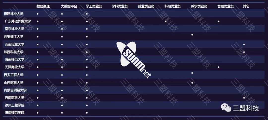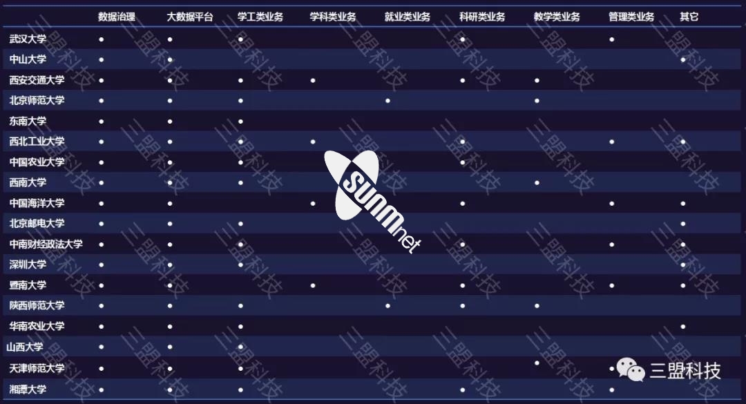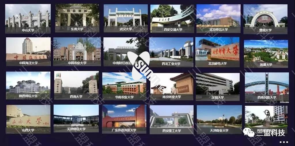 在教育大數(shù)據(jù)領(lǐng)域,三盟科技全國項目案例數(shù)量第一、模塊深度第一、銷售業(yè)績第一。大數(shù)據(jù)系列解決方案已經(jīng)成功在武漢大學(xué)、中山大學(xué)、西安交通大學(xué)、北京師范大學(xué)、東南大學(xué)、西北工業(yè)大學(xué)、中國農(nóng)業(yè)大學(xué)等近200所全國名校應(yīng)用,其中包含22所雙一流大學(xué)。