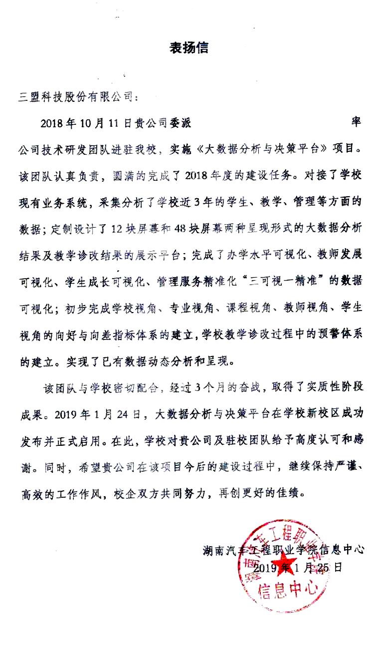 一封封表揚信是對三盟科技的認可,三盟人再次以專業(yè)的服務(wù)精神及扎實的專業(yè)技能贏得了贊美與信任,實施團隊獲得了一致好評。