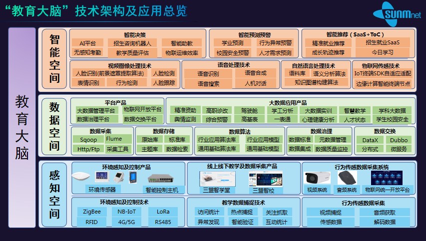 “工欲善其事必先利其器”,2018年三盟科技重磅推出的“教育大腦”戰(zhàn)略,將大數(shù)據(jù)、人工智能、物聯(lián)網(wǎng)等技術(shù),應用于教育信息化2.0建設,其基于AI+大數(shù)據(jù)的智慧校園建設,包括智慧教學環(huán)境、智慧教學資源、智慧校園管理、智慧校園服務等全系列完整解決方案,實現(xiàn)在滿足智慧校園建設標準的基礎(chǔ)上進一步提高高校的教學、科研、管理水平,促進高校的快速發(fā)展。