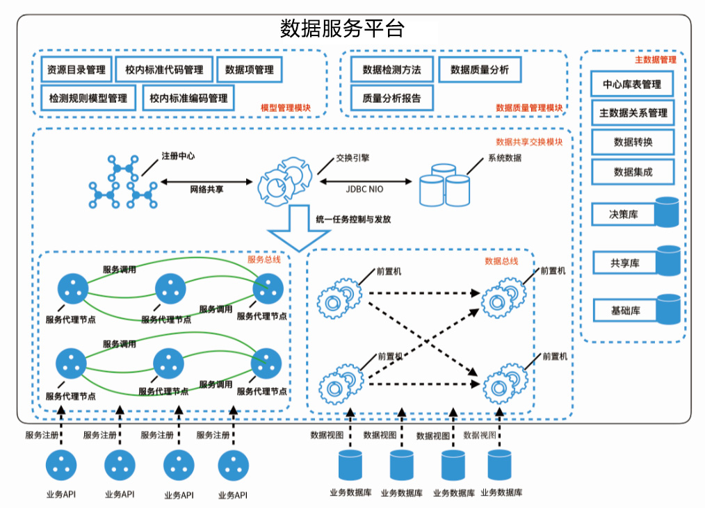 數(shù)據(jù)服務(wù)平臺(tái)是大數(shù)據(jù)時(shí)代的必然產(chǎn)物,是支撐學(xué)校數(shù)據(jù)管理的基礎(chǔ),是以“統(tǒng)一標(biāo)準(zhǔn)”、“統(tǒng)一處理”、“統(tǒng)一交換”、“保證質(zhì)量”、“透明開放”的方式,為不同業(yè)務(wù)系統(tǒng)、不同數(shù)據(jù)庫(kù)、不同數(shù)據(jù)格式之間進(jìn)行數(shù)據(jù)交換而提供服務(wù)的平臺(tái)。