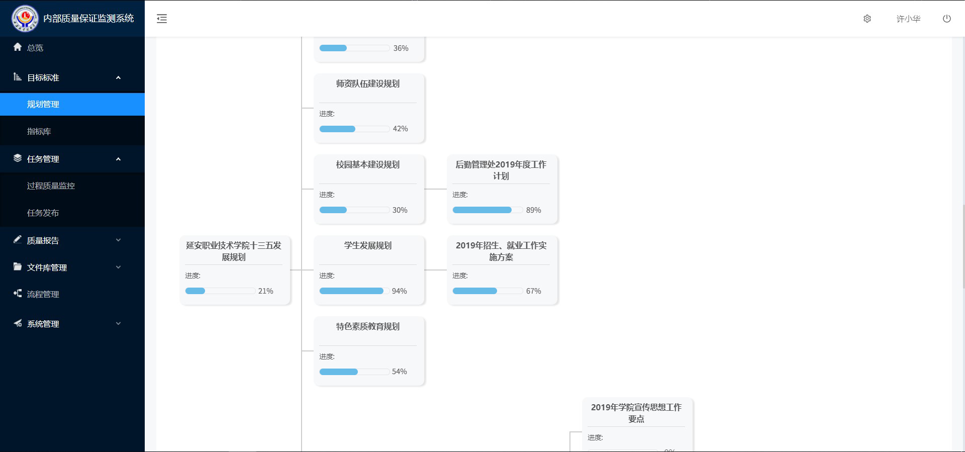 內(nèi)部質(zhì)量保證監(jiān)測(cè)系統(tǒng)針對(duì)學(xué)校診改體系提供不同對(duì)象診改指標(biāo)的詳細(xì)管理操作,并提供大數(shù)據(jù)的深度分析,實(shí)現(xiàn)管理、監(jiān)控、預(yù)警,實(shí)時(shí)診斷和分析,可通過(guò)趨勢(shì)圖、柱形圖、雷達(dá)圖等查看指標(biāo)完成趨勢(shì)及完成進(jìn)度及分析。提供任務(wù)規(guī)劃的具體管理,并直接關(guān)聯(lián)績(jī)效考核,貫穿診改工作事前、事中、事后全過(guò)程。